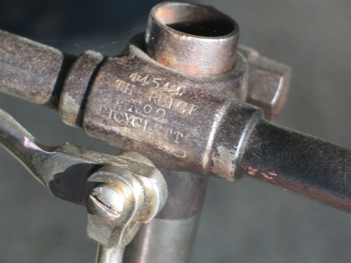 This is a very nice example of the Rudge cross frame, built around 1890. The model is the 'Bicyclette no. 2' and the serial number is 44544. I love Rudge, for inscripting the whole story on top of the handlebars!